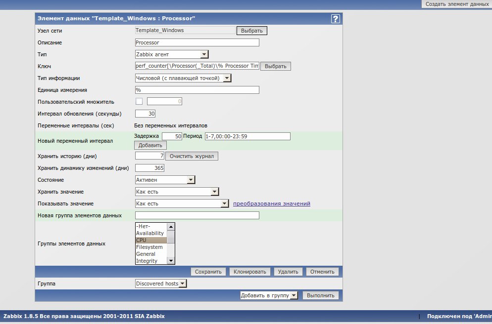 загрузку в реальном времени. Но для начало его надо создать — Настройка — Шаблоны — Template_Windows-Группы элементов данных — CPU = Элементы данных — Создать элемент данных.